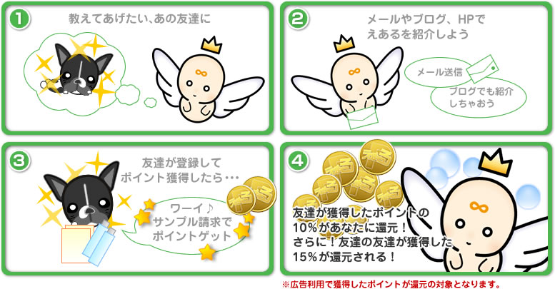 また友達をメールやブログでバナーを貼ってえあるを紹介しましょう。友達が獲得したポイントの10%また友達が紹介した友達の15%が還元される為続けていくうちに換金に必要な1000ポイント500円がだんだん早く獲得できるようになります。