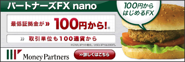 FX私の場合今ココを中心にFX投資をやっています理由や100円から投資できる!FX勝てる確立は五分五分だけど掛け金は変えられるこれなら勝てると思いませんか!マネーパートナーズ 100通過単位の取引ができるようになりました。最小必要証拠金は、(ZAR/JPY)で100円、(USD/JPY)でも200円です!100円から取引可能!!超初心者におすすめ。